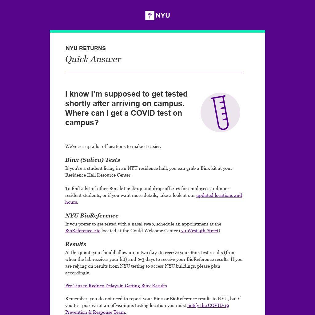 At this point, you should allow up to two days to receive your Binx test results (from when the lab receives your kit) and 2-3 days to receive your BioReference results. If you are relying on results from NYU testing to access NYU buildings, please plan accordingly.