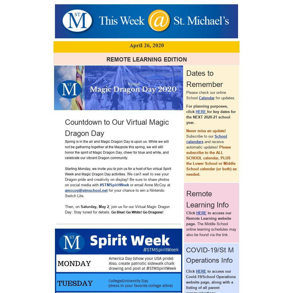 Starting Monday, we invite you to join us for a host of fun virtual Spirit Week and Magic Dragon Day activities. We can't wait to see your Dragon pride and creativity on display! Be sure to share photos on social media with #STMSpiritWeek or email Anne McCoy at amccoy@stmschool.net for your chance to win a Nintendo Switch Lite.