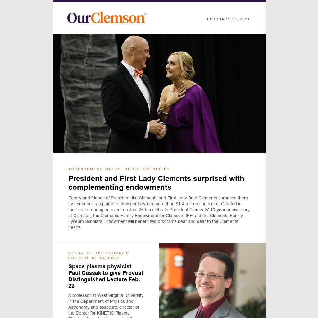 Family and friends of President Jim Clements and First Lady Beth Clements surprised them by announcing a pair of endowments worth more than $1.4 million combined. Created in their honor during an event on Jan. 26 to celebrate President Clements' 10-year anniversary at Clemson, the Clements Family Endowment for ClemsonLIFE and the Clements Family Lyceum Scholars Endowment will benefit two programs near and dear to the Clements’ hearts.