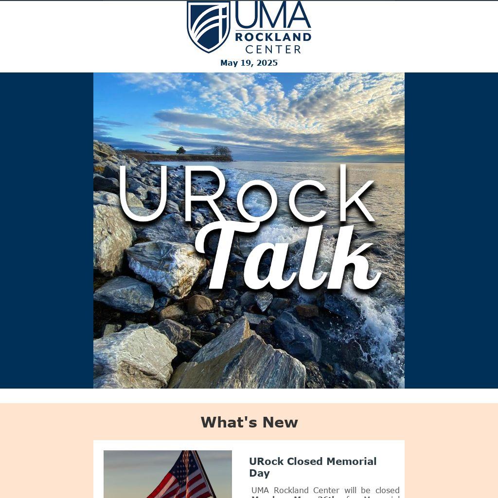 UMA Rockland Center will be closed Monday, May 26th, for Memorial Day. Tuesday through Friday the center will be open during regular business hours. To find URock's Summer hours, please follow the link below.Â