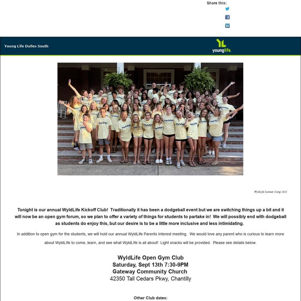 Tonight is our annual WyldLife Kickoff Club!  Traditionally it has been a dodgeball event but we are switching things up a bit and it will now be an open gym forum, so we plan to offer a variety of things for students to partake in!  We will possibly end with dodgeball as students do enjoy this, but our desire is to be a little more inclusive and less intimidating.