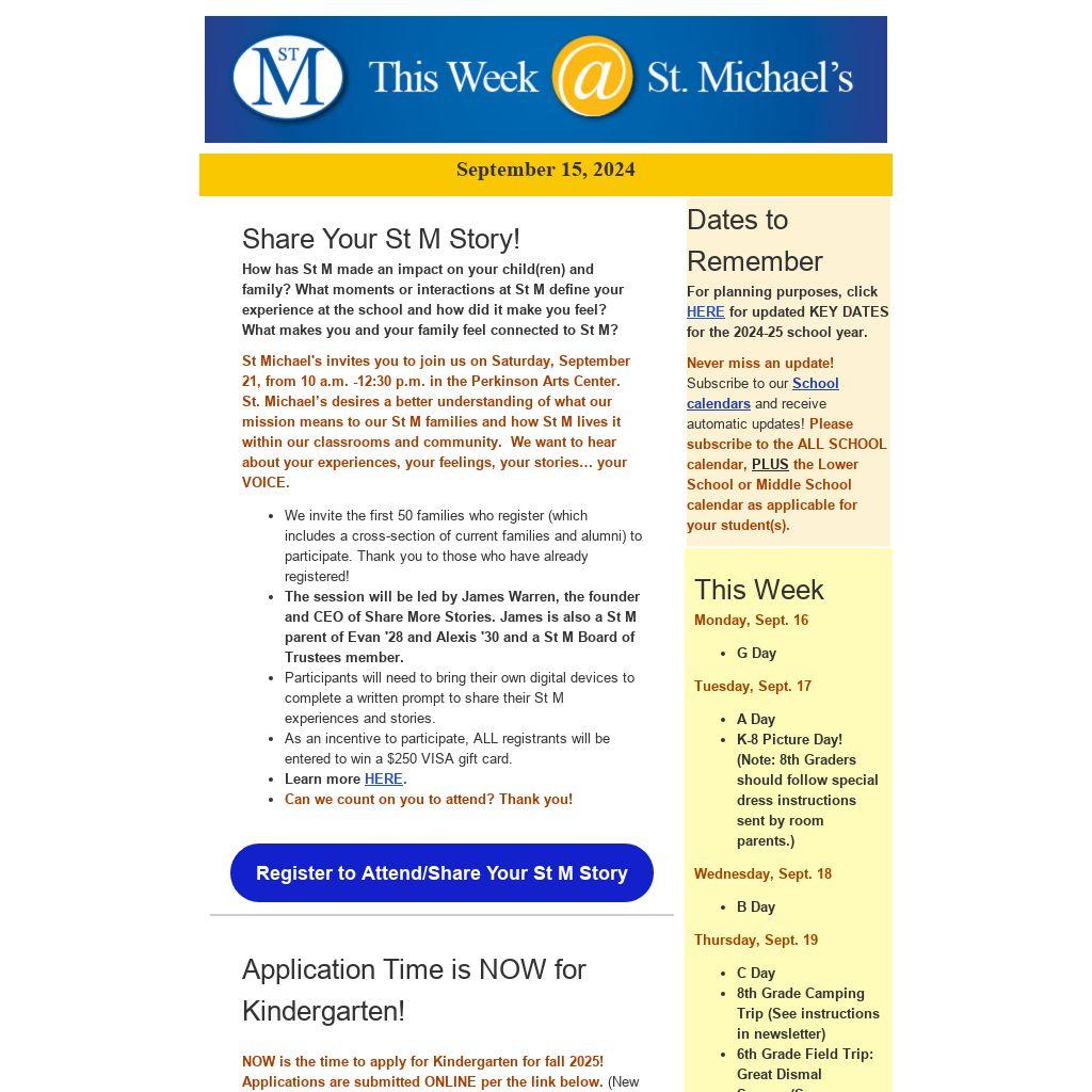 St Michael's invites you to join us on Saturday, September 21, from 10 a.m. -12:30 p.m. in the Perkinson Arts Center. St. Michael’s desires a better understanding of what our mission means to our St M families and how St M lives it within our classrooms and community. We want to hear about your experiences, your feelings, your stories… your VOICE.