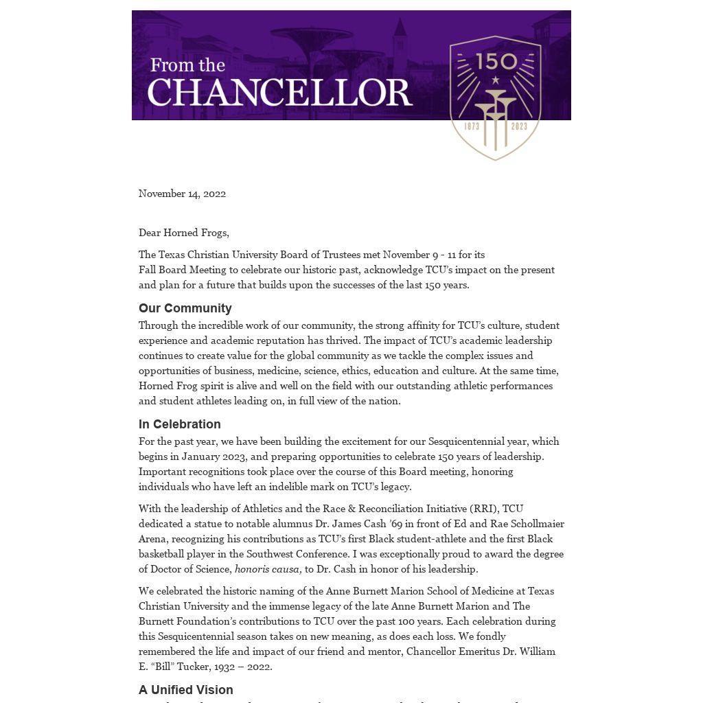 Trustee Mike Berry, chair of the Buildings and Grounds Committee, discussed the commission of a new campus master plan study which will examine TCU’s strategic growth plan and alignment of our physical campus to mission and vision. The new campus master plan provides an opportunity for TCU to consider how spaces on campus – academic programs, schools, colleges, gathering and living – support TCU for the next 150 years. A committee of students, faculty and staff will be assembled in early 2023.