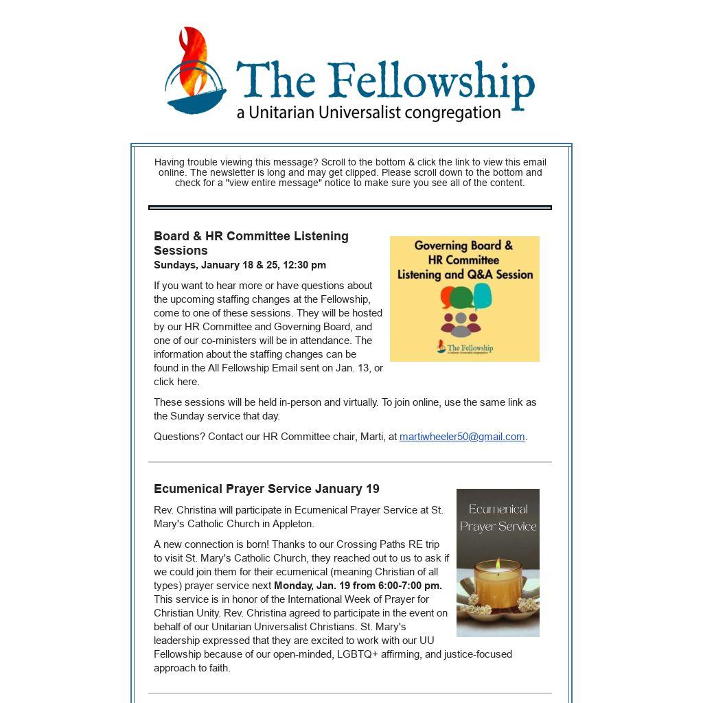 If you want to hear more or have questions about the upcoming staffing changes at the Fellowship, come to one of these sessions. They will be hosted by our HR Committee and Governing Board, and one of our co-ministers will be in attendance. The information about the staffing changes can be found in the All Fellowship Email sent on Jan. 13, or click here.