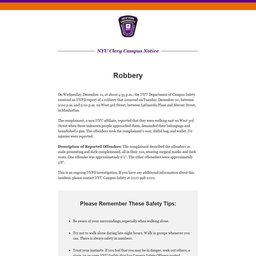 On Wednesday, December 21, at about 4:35 p.m., the NYU Department of Campus Safety received an NYPD report of a robbery that occurred on Tuesday, December 20, between 9:00 p.m. and 9:20 p.m. on West 3rd Street, between LaGuardia Place and Mercer Street, in Manhattan.