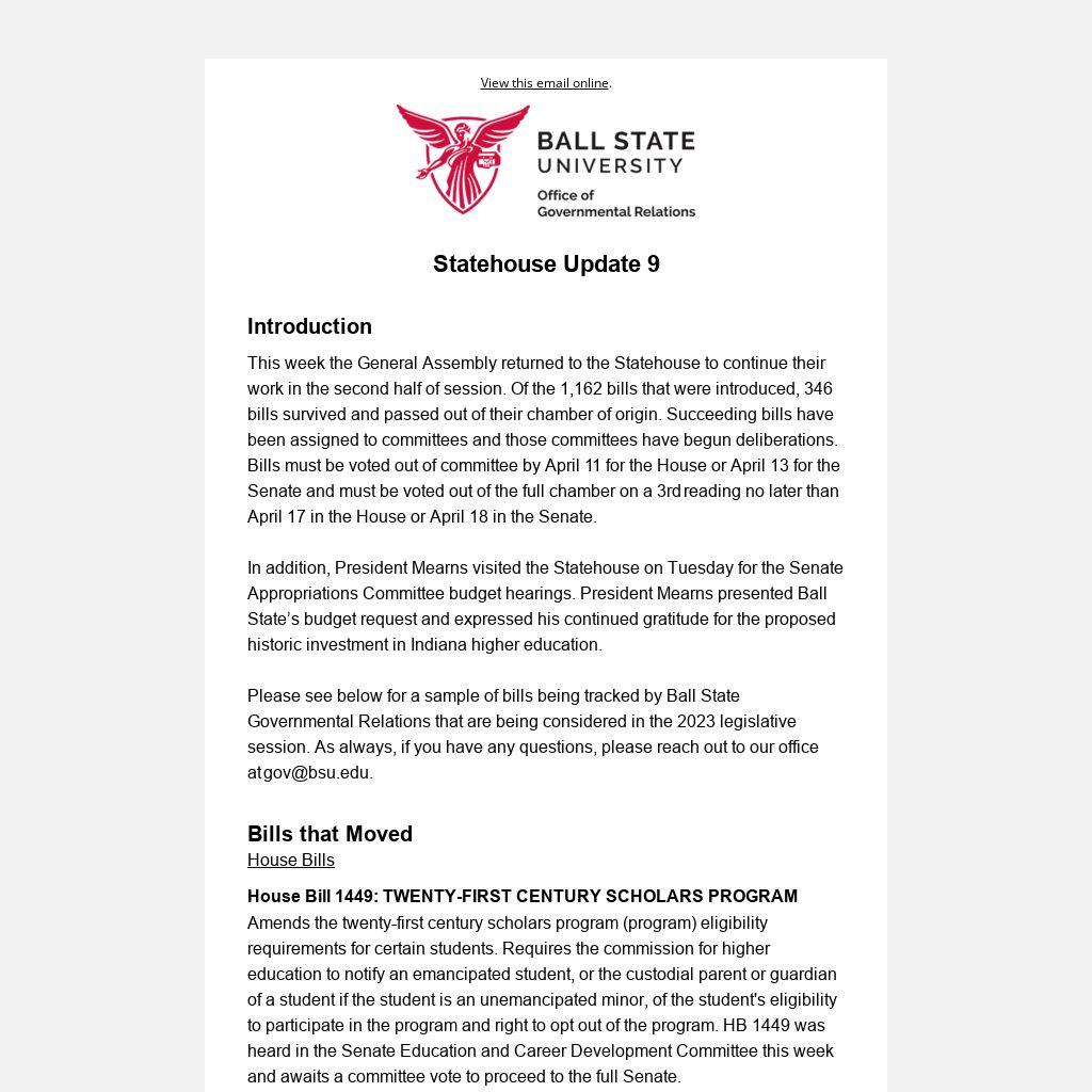 Please see below for a sample of bills being tracked by Ball State Governmental Relations that are being considered in the 2023 legislative session. As always, if you have any questions, please reach out to our office at gov@bsu.edu.