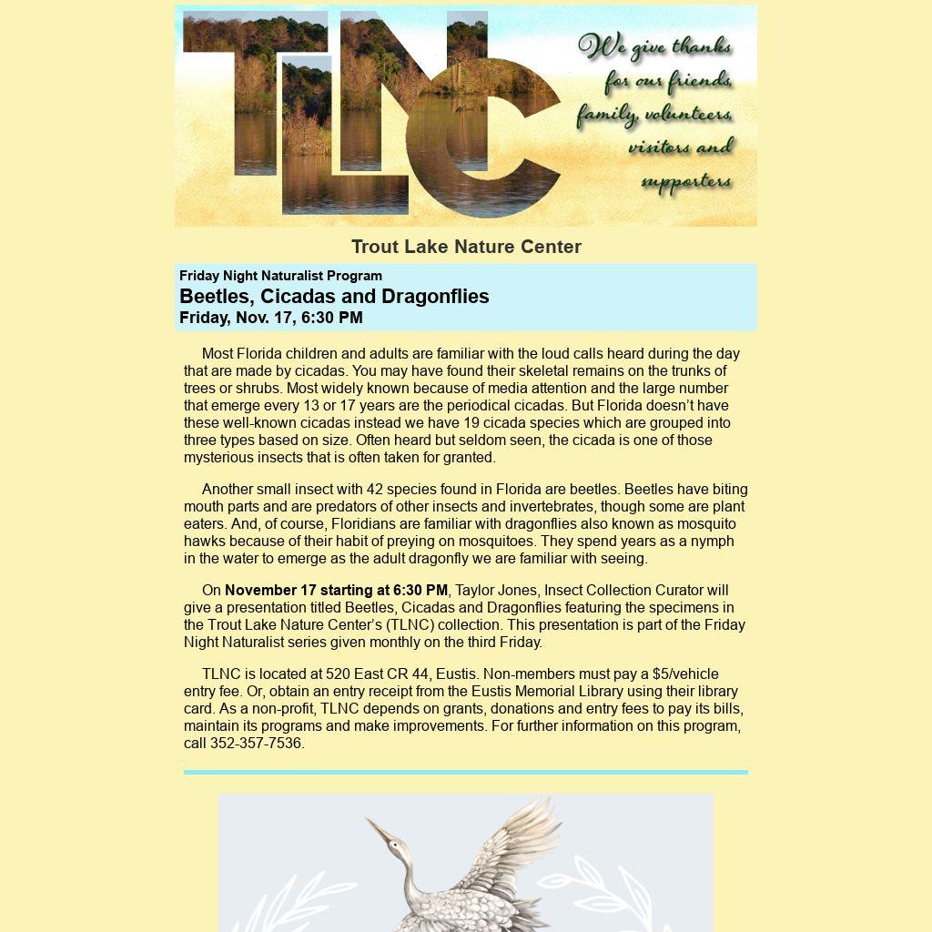 On November 17 starting at 6:30 PM, Taylor Jones, Insect Collection Curator will give a presentation titled Beetles, Cicadas and Dragonflies featuring the specimens in the Trout Lake Nature Center’s (TLNC) collection. This presentation is part of the Friday Night Naturalist series given monthly on the third Friday.