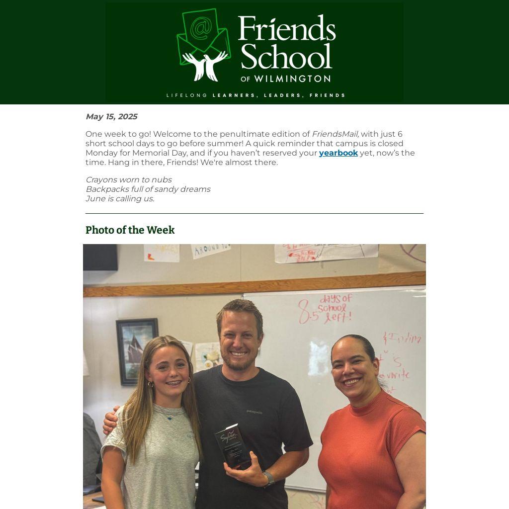 One week to go! Welcome to the penultimate edition of FriendsMail, with just 6 short school days to go before summer! A quick reminder that campus is closed Monday for Memorial Day, and if you haven’t reserved your yearbook yet, now’s the time. Hang in there, Friends! We're almost there.