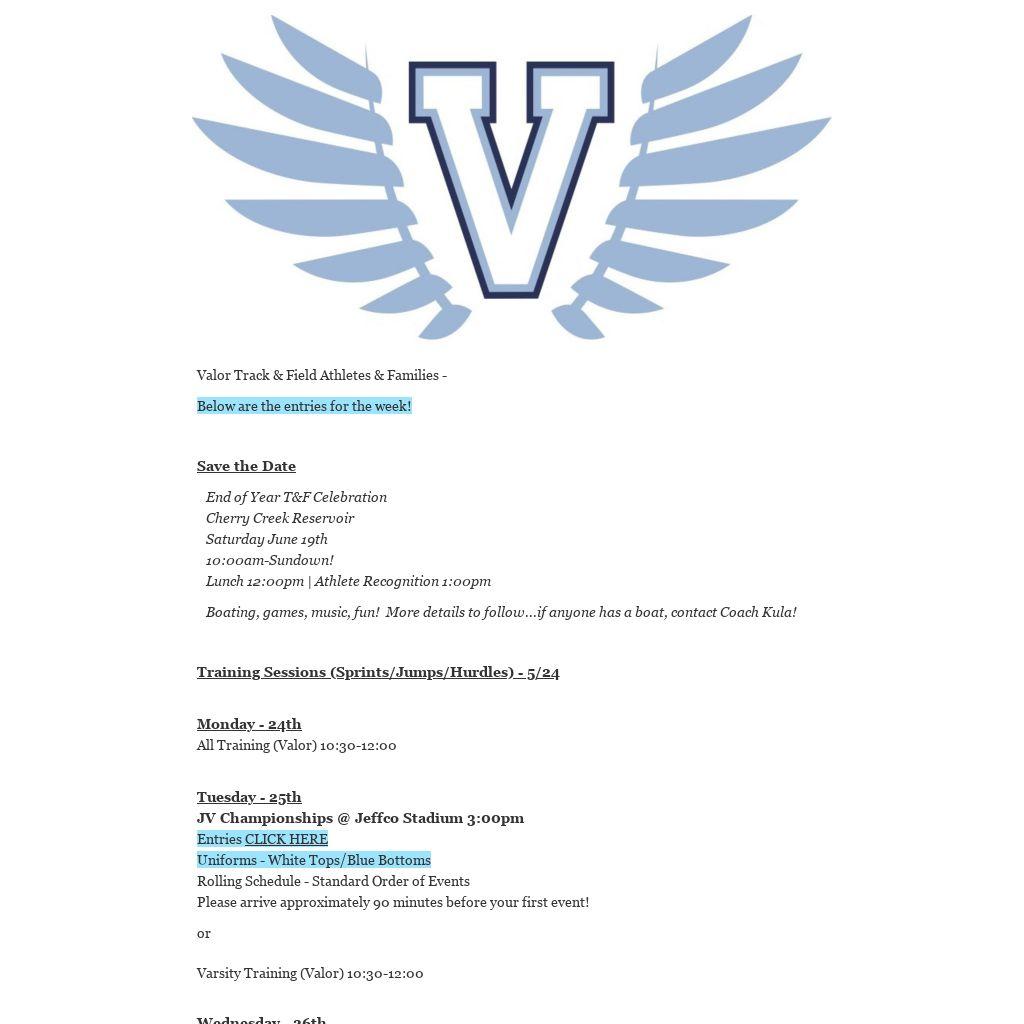 *Distance and Throws schedule will be sent by Coach Rainsberger and Coach Moore!