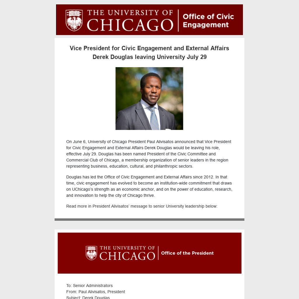 I am grateful for Derek’s many contributions to the University, and for his service as a trusted and insightful colleague. Please join me in wishing him great success in his new role at one of Chicago’s most highly regarded civic institutions.