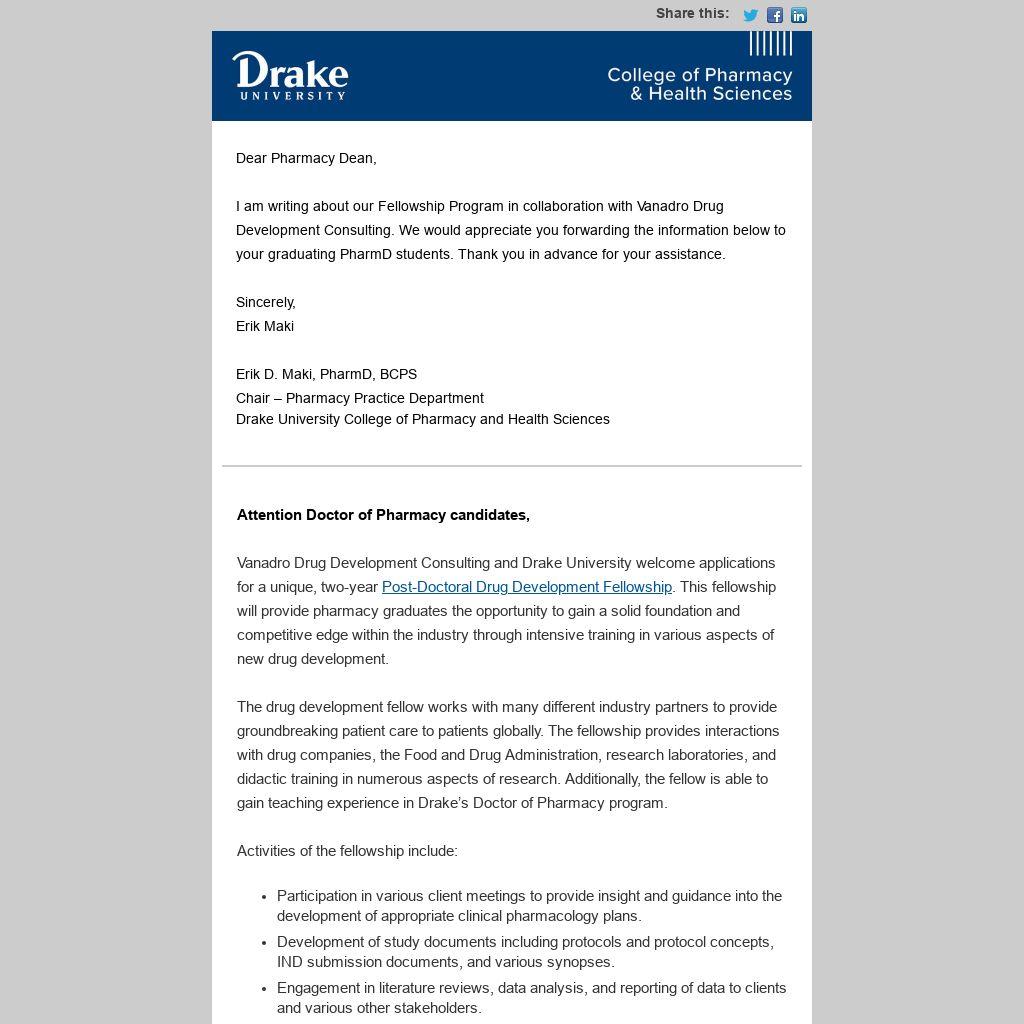 Vanadro Drug Development Consulting and Drake University welcome applications for a unique, two-year Post-Doctoral Drug Development Fellowship. This fellowship will provide pharmacy graduates the opportunity to gain a solid foundation and competitive edge within the industry through intensive training in various aspects of new drug development.