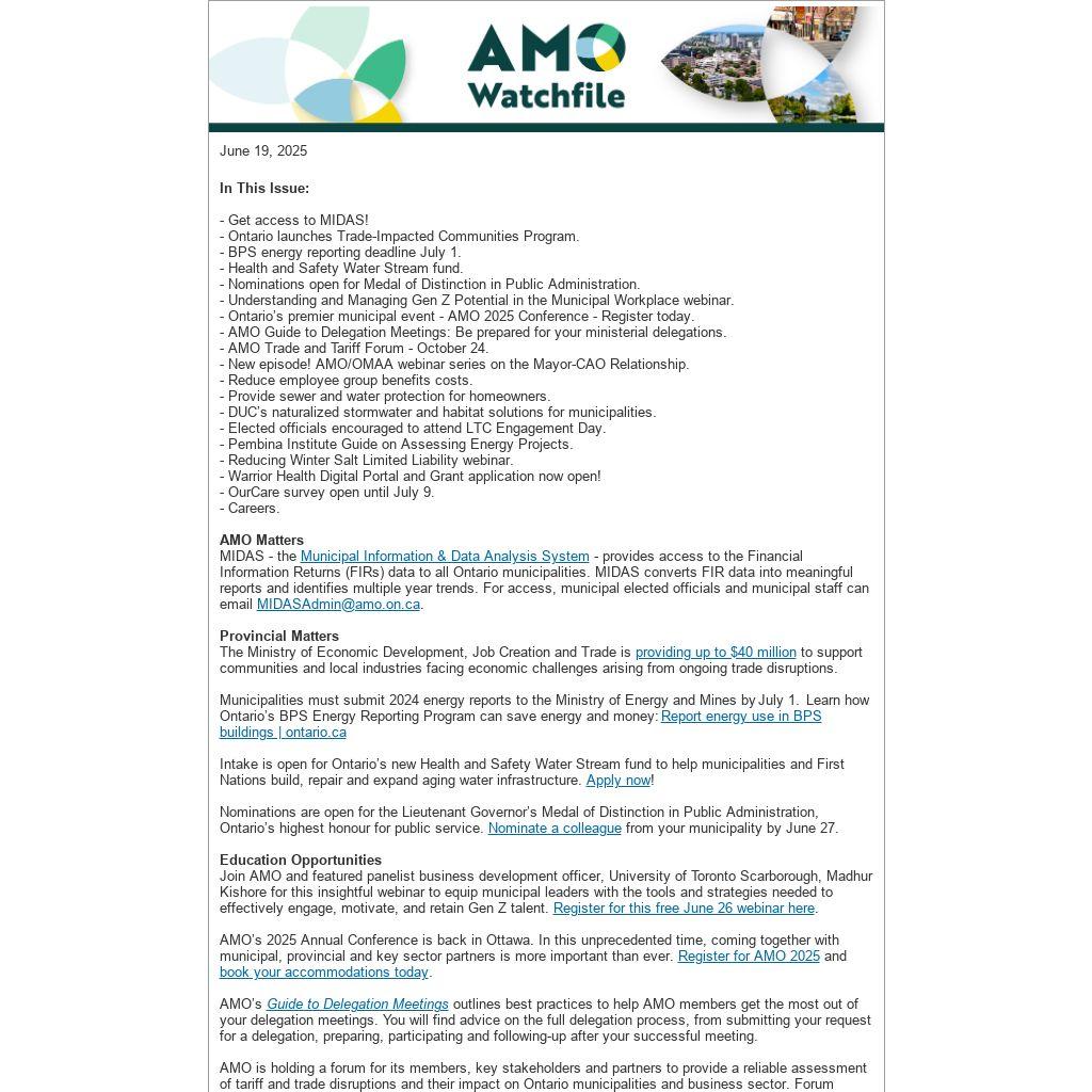 *Disclaimer: The Association of Municipalities of Ontario (AMO) is unable to provide any warranty regarding the accuracy or completeness of third-party submissions. Distribution of these items does not imply an endorsement of the views, information or services mentioned.