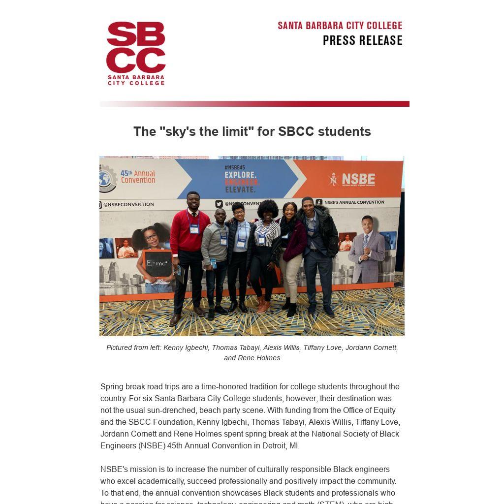 Spring break road trips are a time-honored tradition for college students throughout the country. For six Santa Barbara City College students, however, their destination was not the usual sun-drenched, beach party scene. With funding from the Office of Equity and the SBCC Foundation, Kenny Igbechi, Thomas Tabayi, Alexis Willis, Tiffany Love, Jordann Cornett and Rene Holmes spent spring break at the National Society of Black Engineers (NSBE) 45th Annual Convention in Detroit, MI.