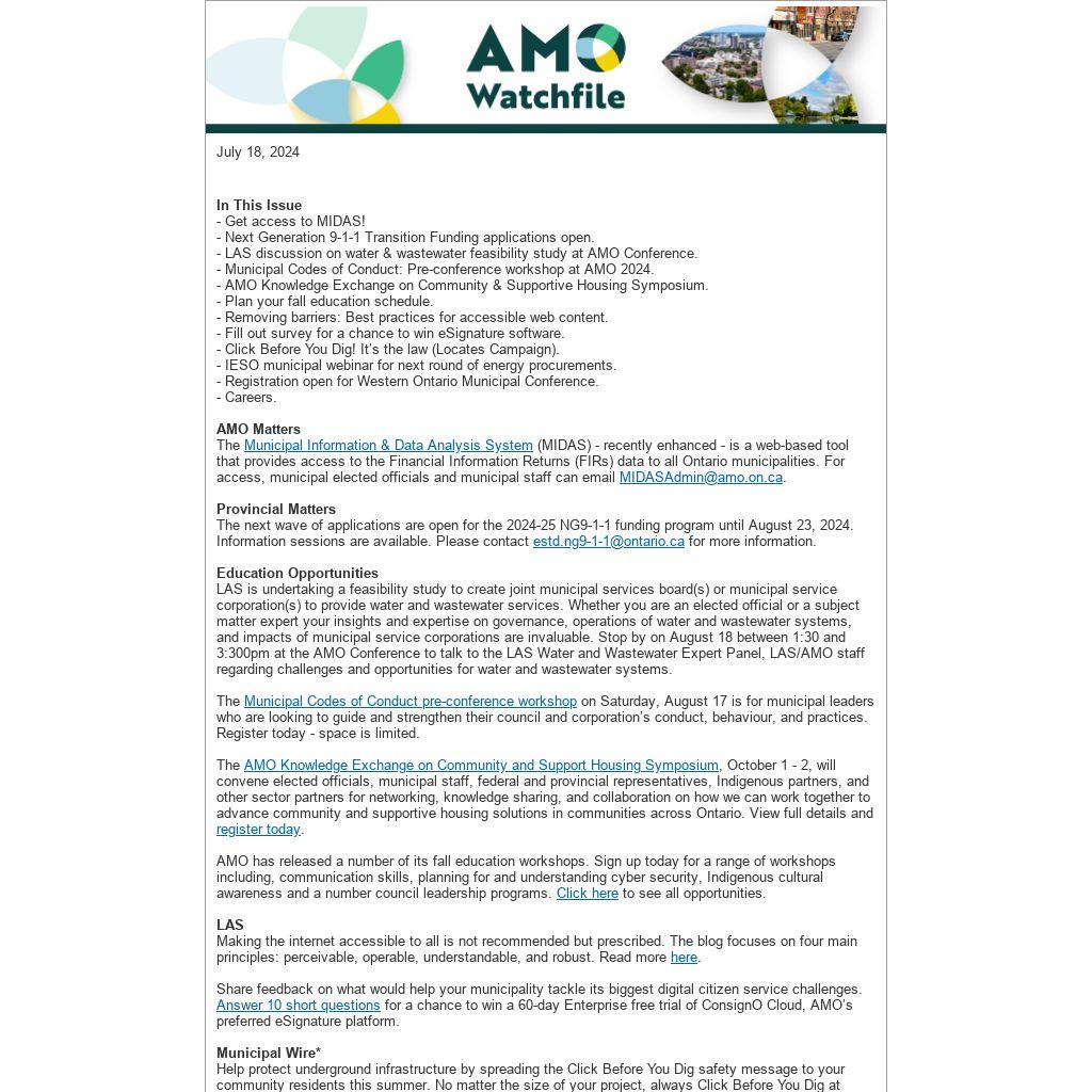 *Disclaimer: The Association of Municipalities of Ontario (AMO) is unable to provide any warranty regarding the accuracy or completeness of third-party submissions. Distribution of these items does not imply an endorsement of the views, information or services mentioned.