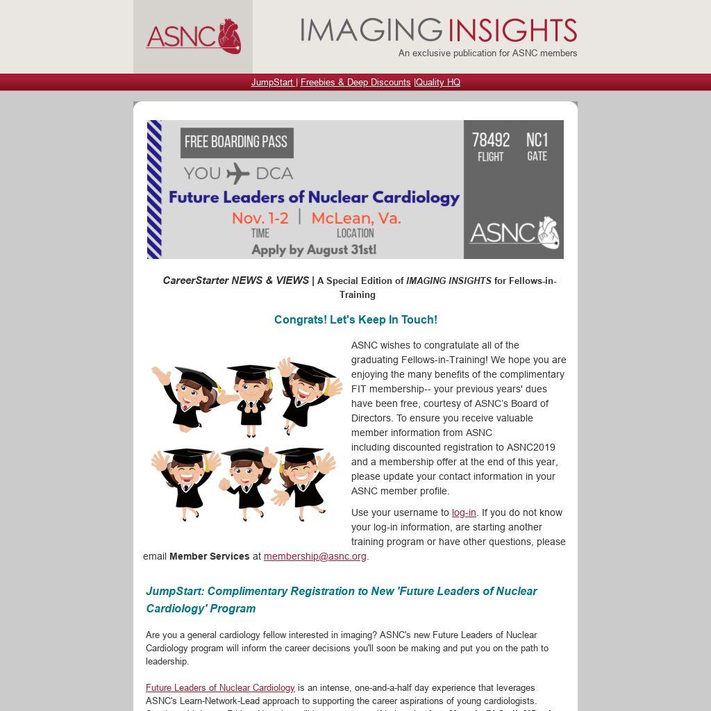 | ASNC wishes to congratulate all of the graduating Fellows-in-Training! We hope you are enjoying the many benefits of the complimentary FIT membership-- your previous years' dues have been free, courtesy of ASNC’s Board of Directors. To ensure you receive valuable member information from ASNC including discounted registration to ASNC2019 and a membership offer at the end of this year, please update your contact information in your ASNC member profile.