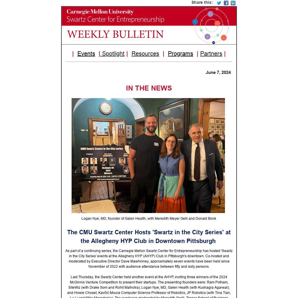 Have startup news or opportunities to share? Have questions about the Swartz Center Weekly Bulletin? Send news, opportunities or questions to Sonya Ford, Program Manager.