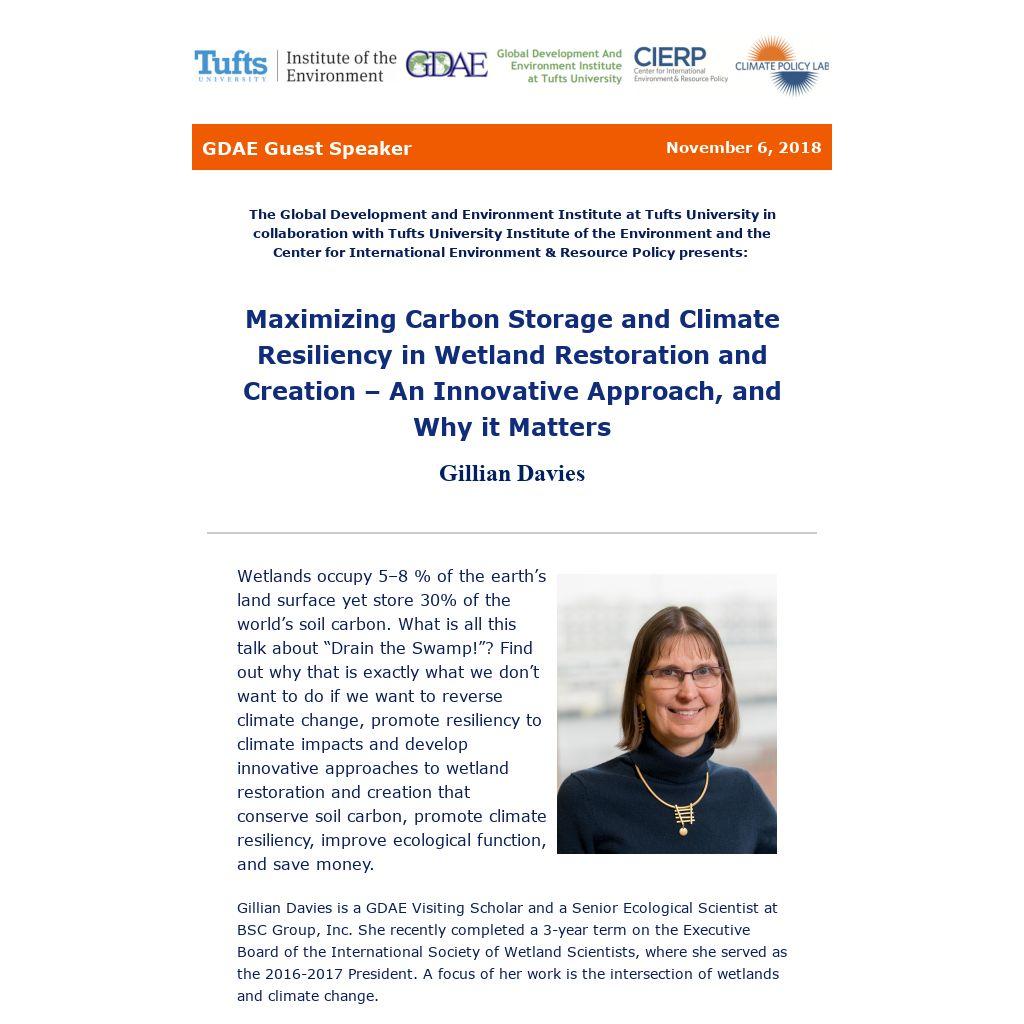 Gillian Davies is a GDAE Visiting Scholar and a Senior Ecological Scientist at BSC Group, Inc. She recently completed a 3-year term on the Executive Board of the International Society of Wetland Scientists, where she served as the 2016-2017 President. A focus of her work is the intersection of wetlands and climate change.