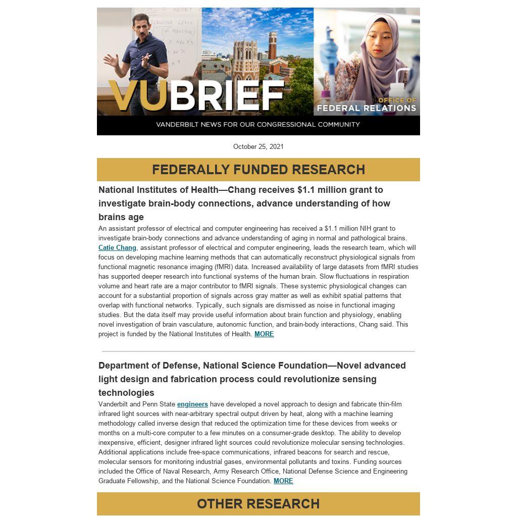 VUbrief summarizes Vanderbilt news items to inform our Congressional community of developments at the university. Visit our website for past issues of VUbrief. Vanderbilt University Office of Federal Relations (202) 216-4361