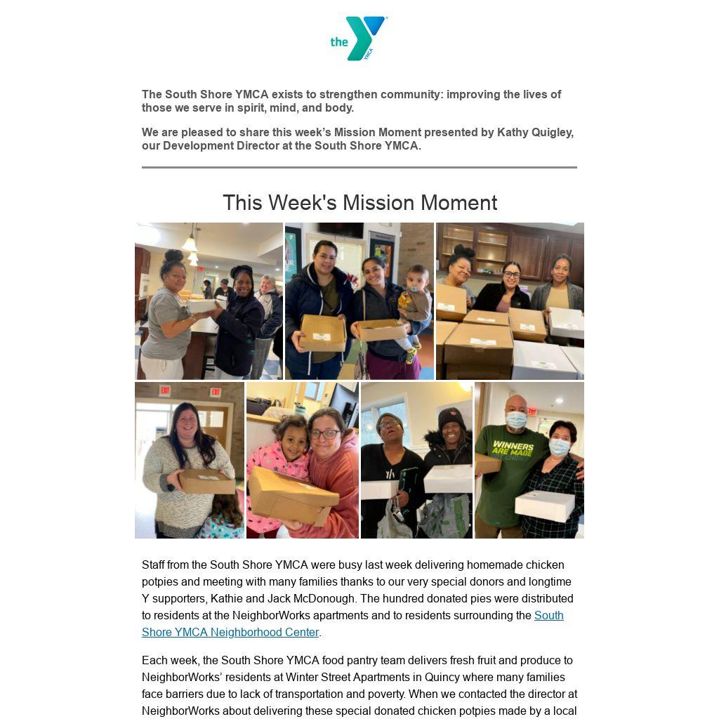 Staff from the South Shore YMCA were busy last week delivering homemade chicken potpies and meeting with many families thanks to our very special donors and longtime Y supporters, Kathie and Jack McDonough. The hundred donated pies were distributed to residents at the NeighborWorks apartments and to residents surrounding the South Shore YMCA Neighborhood Center.