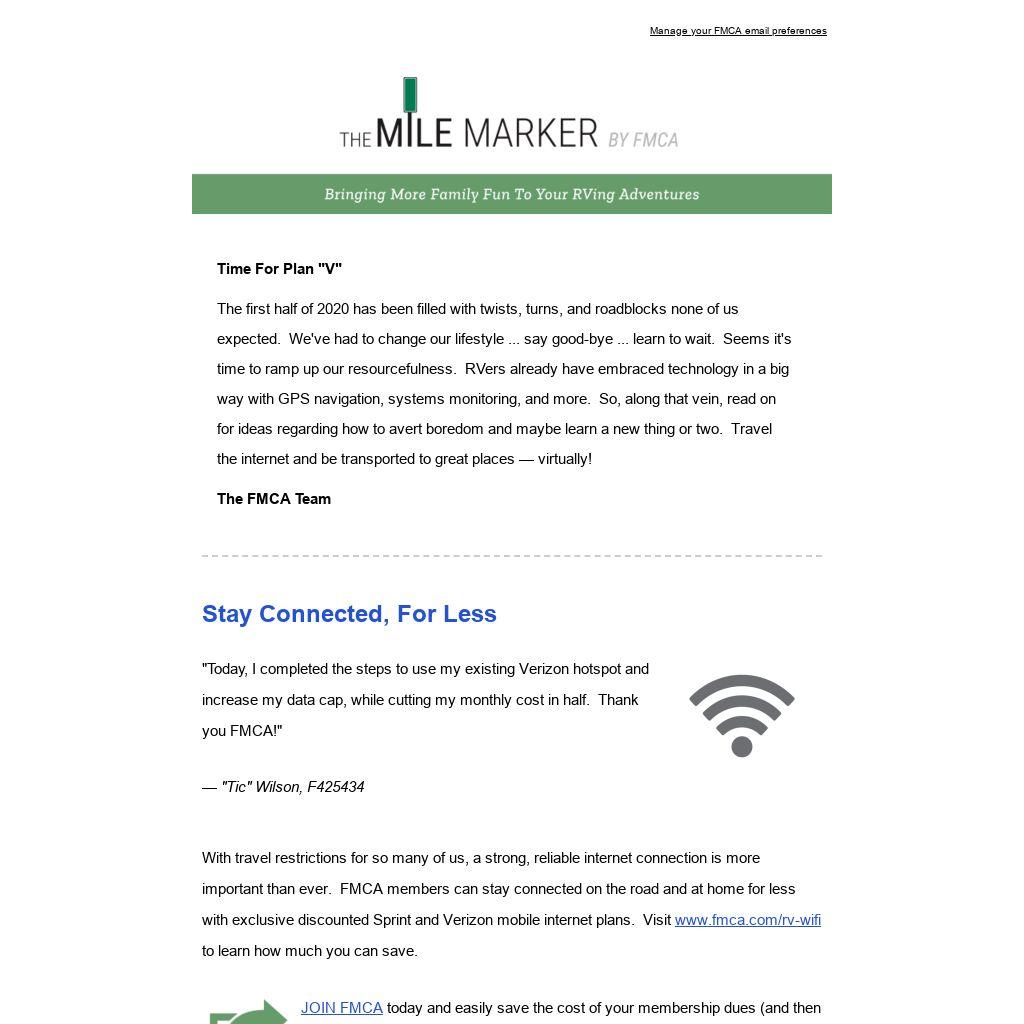 | With travel restrictions for so many of us, a strong, reliable internet connection is more important than ever. FMCA members can stay connected on the road and at home for less with exclusive discounted Sprint and Verizon mobile internet plans. Visit www.fmca.com/rv-wifi to learn how much you can save.