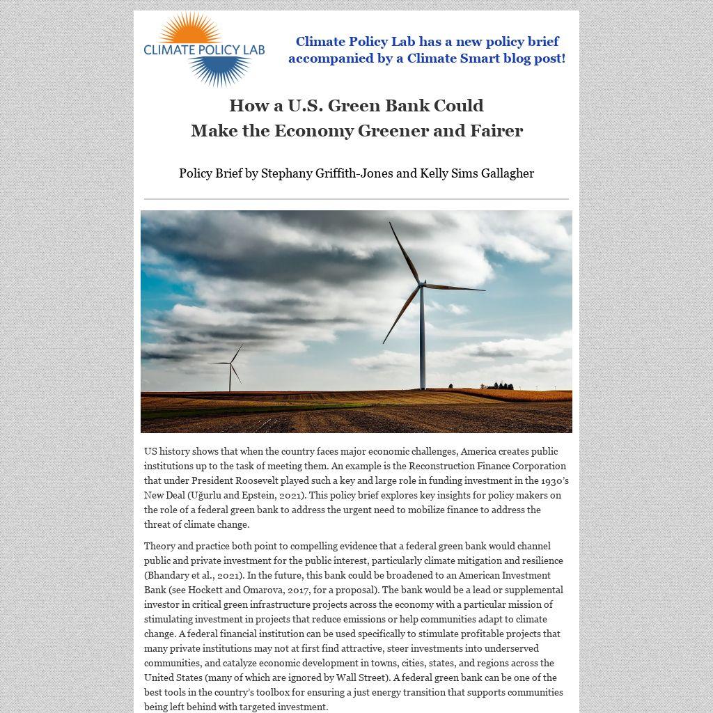 US history shows that when the country faces major economic challenges, America creates public institutions up to the task of meeting them. An example is the Reconstruction Finance Corporation that under President Roosevelt played such a key and large role in funding investment in the 1930’s New Deal (Uğurlu and Epstein, 2021). This policy brief explores key insights for policy makers on the role of a federal green bank to address the urgent need to mobilize finance to address the threat of climate change.
