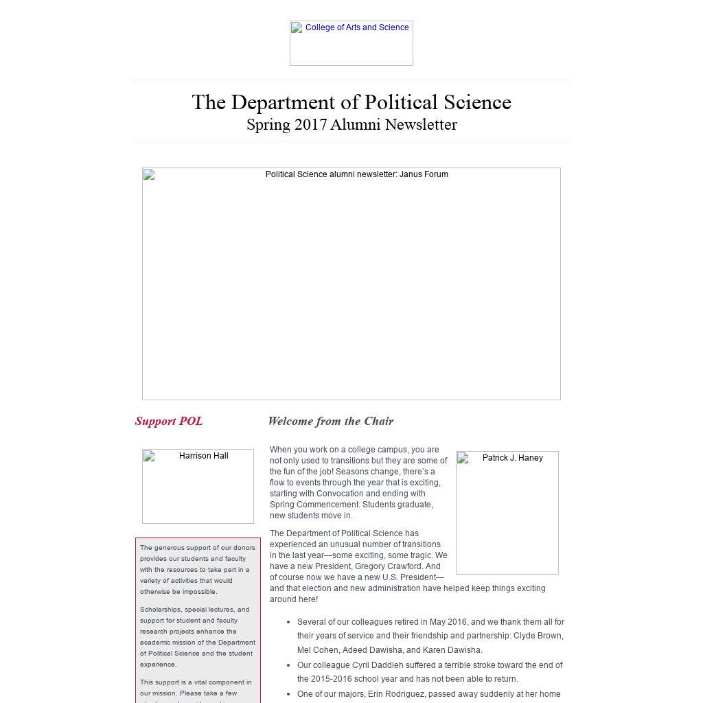 | When you work on a college campus, you are not only used to transitions but they are some of the fun of the job! Seasons change, there’s a flow to events through the year that is exciting, starting with Convocation and ending with Spring Commencement. Students graduate, new students move in. The Department of Political Science has experienced an unusual number of transitions in the last year—some exciting, some tragic. We have a new President, Gregory Crawford. And of course now we have a new U.S. President—and that election and new administration have helped keep things exciting around here! - Several of our colleagues retired in May 2016, and we thank them all for their years of service and their friendship and partnership: Clyde Brown, Mel Cohen, Adeed Dawisha, and Karen Dawisha.