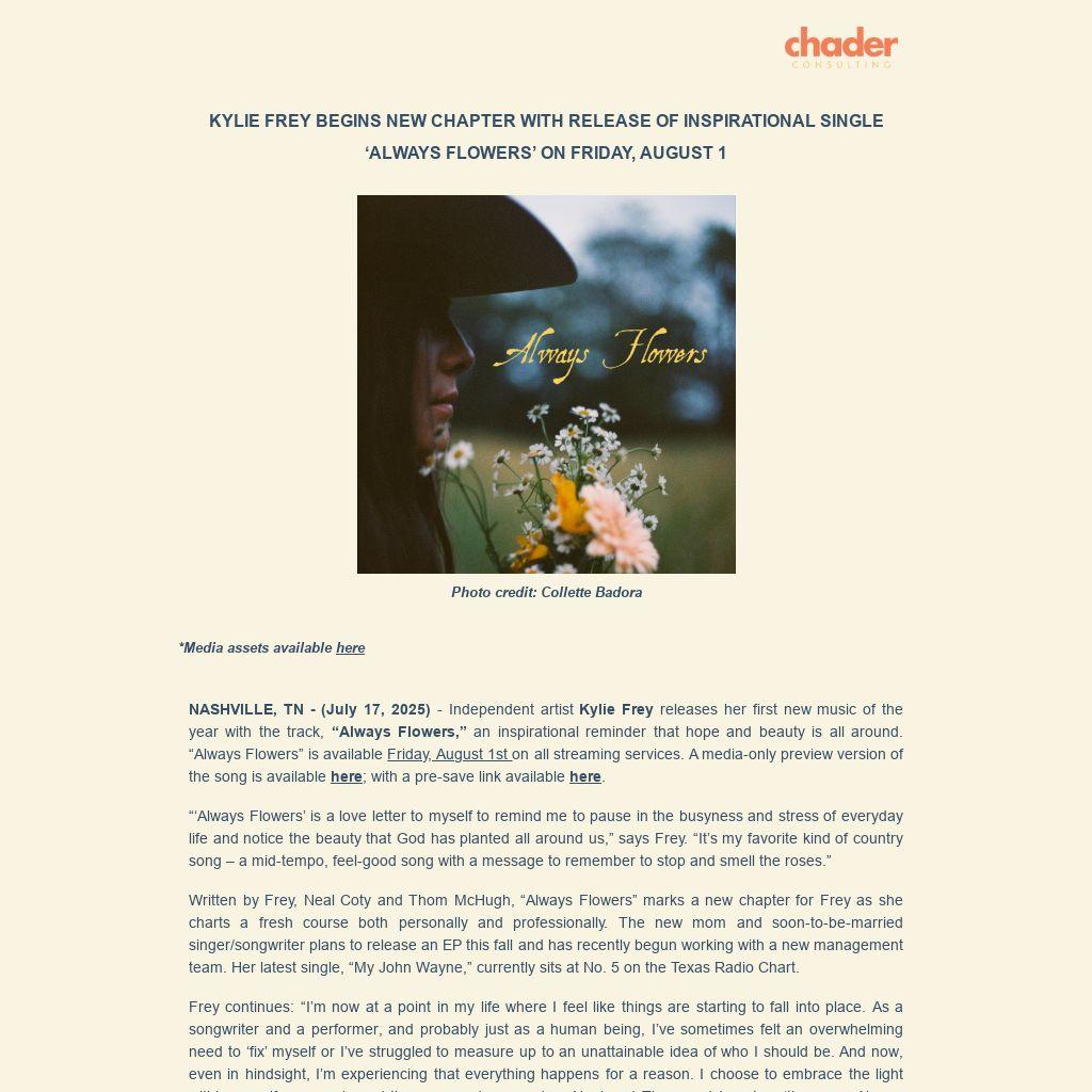 NASHVILLE, TN - (July 17, 2025) - Independent artist Kylie Frey releases her first new music of the year with the track, “Always Flowers,” an inspirational reminder that hope and beauty is all around. “Always Flowers” is available Friday, August 1st on all streaming services. A media-only preview version of the song is available here; with a pre-save link available here.