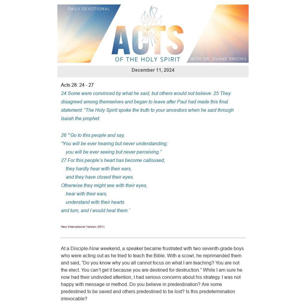 At a Disciple-Now weekend, a speaker became frustrated with two seventh-grade boys who were acting out as he tried to teach the Bible. With a scowl, he reprimanded them and said, “Do you know why you all cannot focus on what I am teaching? You are not the elect. You can’t get it because you are destined for destruction.” While I am sure he now had their undivided attention, I had serious concerns about his strategy. I was not happy with message or method. Do you believe in predestination? Are some predestined to be saved and others predestined to be lost? Is this predetermination irrevocable?