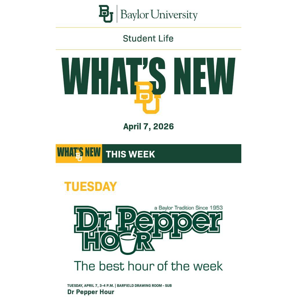 If you are a department or Baylor student organization and have items you would like to see appear in What's New BU, submit them for consideration by Friday at 8 a.m. by clicking here or emailing them to whatsnew@baylor.edu. View past issues of What’s New BU here.