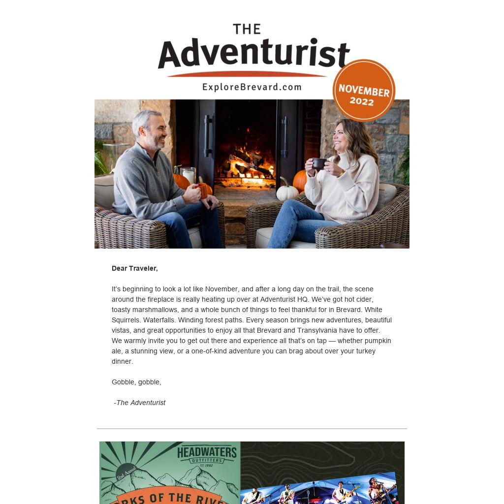 It’s beginning to look a lot like November, and after a long day on the trail, the scene around the fireplace is really heating up over at Adventurist HQ. We’ve got hot cider, toasty marshmallows, and a whole bunch of things to feel thankful for in Brevard. White Squirrels. Waterfalls. Winding forest paths. Every season brings new adventures, beautiful vistas, and great opportunities to enjoy all that Brevard and Transylvania have to offer. We warmly invite you to get out there and experience all that’s on tap — whether pumpkin ale, a stunning view, or a one-of-kind adventure you can brag about over your turkey dinner.