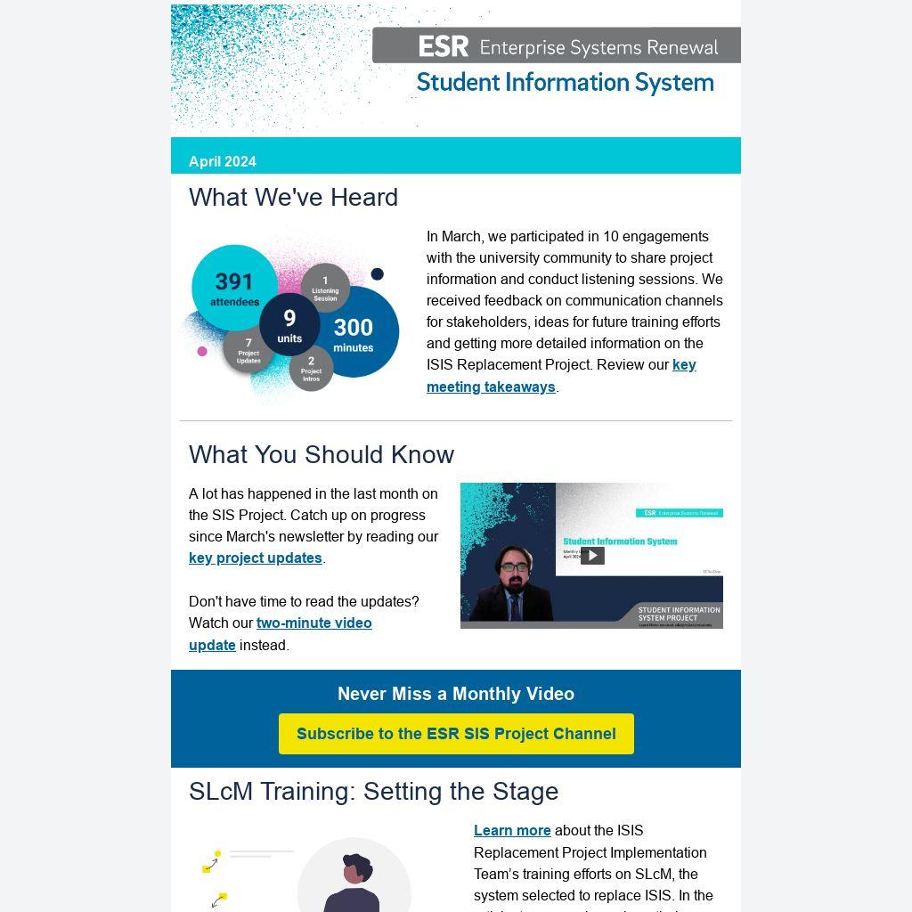 Currently, the ESR SIS Newsletter is sent on the third Thursday of each month. However, we are making a change to our release date to ensure that you are receiving the most up-to-date progress and information on the SIS Project. Starting next month, the ESR SIS Newsletter will be delivered the last Thursday of every month. This is effective starting with the May 2024 ESR SIS Newsletter to be delivered on May 30, 2024.