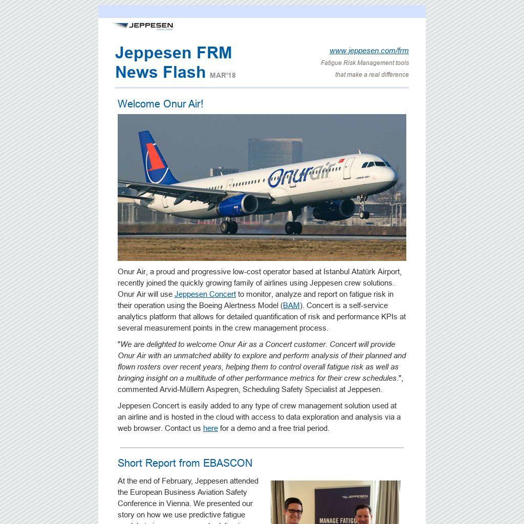 Jeppesen have a couple of FRM solutions particularly well suited for business aviation; Jeppesen Concert for the monitoring and analysis of the overall operation, and CrewAlert for data collection and fatigue risk awareness and prevention by the crew.