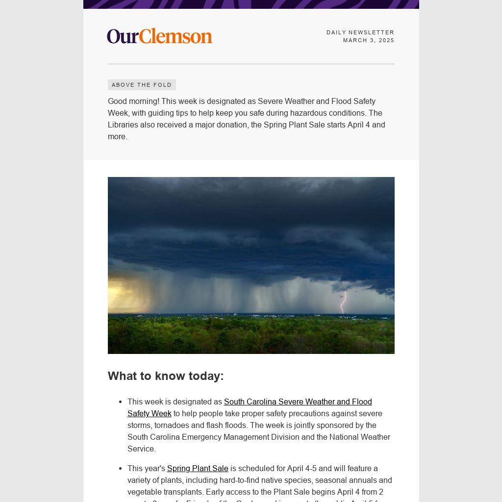 Good morning! This week is designated as Severe Weather and Flood Safety Week, with guiding tips to help keep you safe during hazardous conditions. The Libraries also received a major donation, the Spring Plant Sale starts April 4 and more.