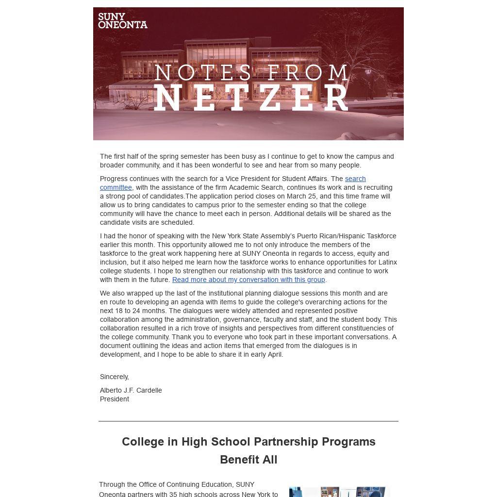 We also wrapped up the last of the institutional planning dialogue sessions this month and are en route to developing an agenda with items to guide the college's overarching actions for the next 18 to 24 months. The dialogues were widely attended and represented positive collaboration among the administration, governance, faculty and staff, and the student body. This collaboration resulted in a rich trove of insights and perspectives from different constituencies of the college community. Thank you to everyone who took part in these important conversations. A document outlining the ideas and action items that emerged from the dialogues is in development, and I hope to be able to share it in early April.