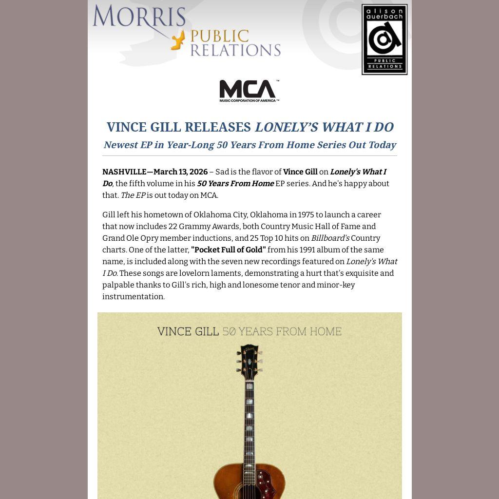 For the equally gentle “Lonely's What I Do,” the EP’s title track, Gill teamed again with Vaughn, as well as Belle Frantz. Gill says, “it's a little tip of the hat to Bob Wills’ 'Faded Love.'”