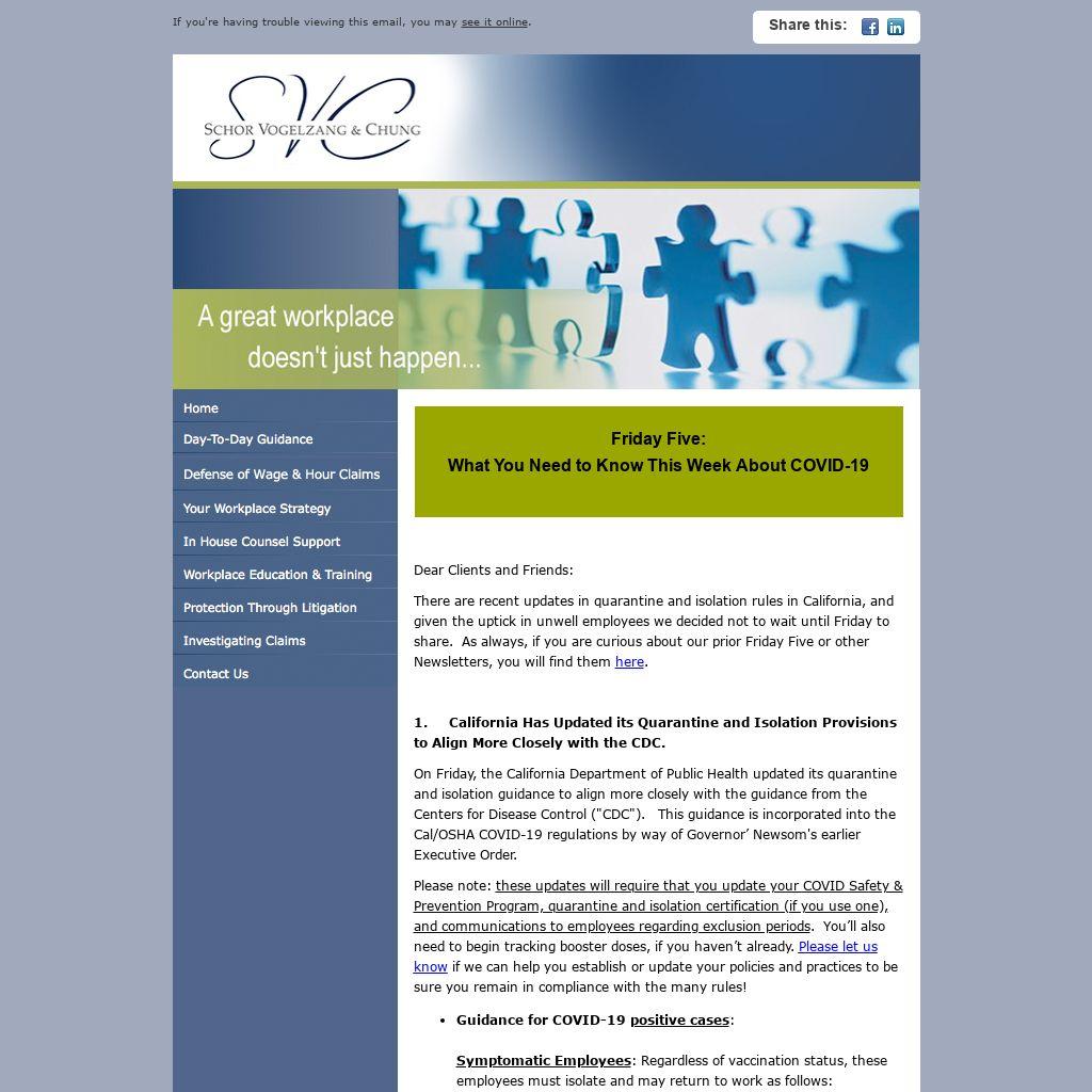 There are recent updates in quarantine and isolation rules in California, and given the uptick in unwell employees we decided not to wait until Friday to share. As always, if you are curious about our prior Friday Five or other Newsletters, you will find them here.