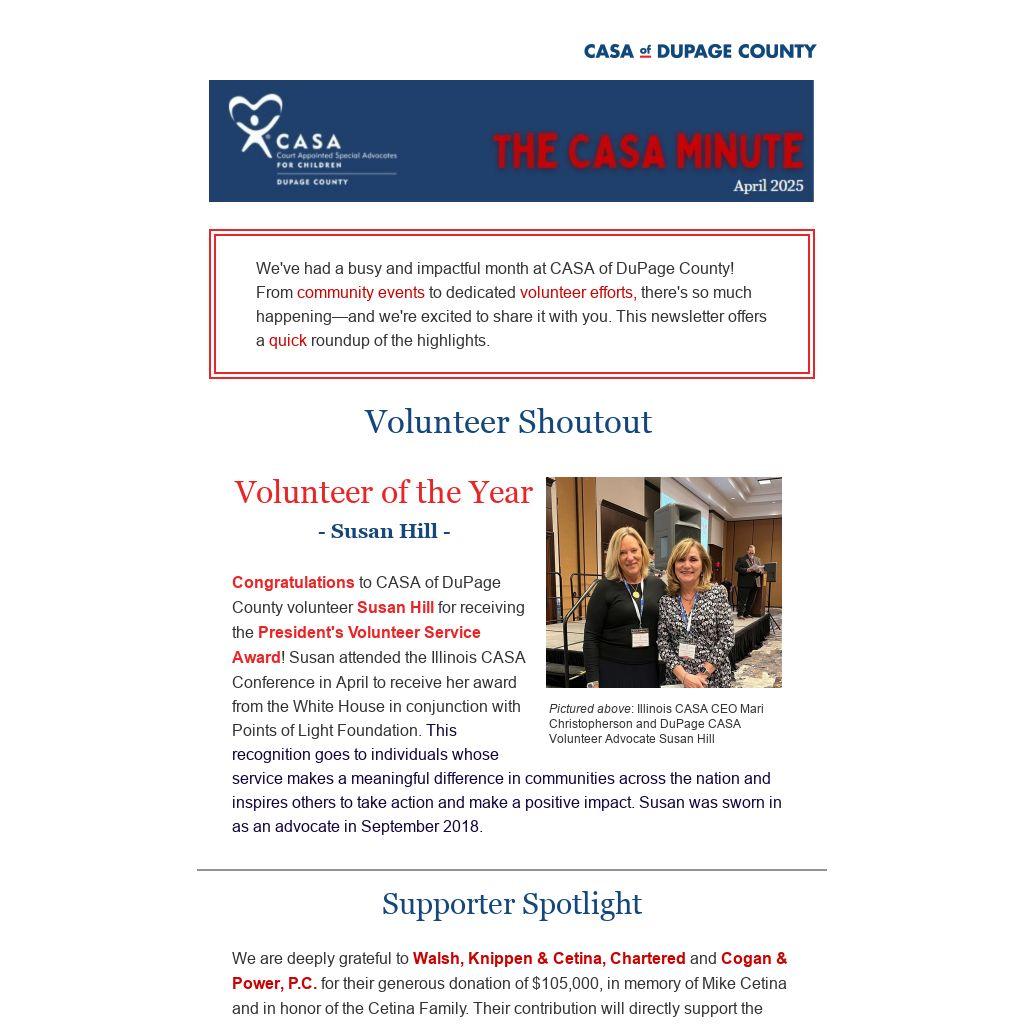 We've had a busy and impactful month at CASA of DuPage County! From community events to dedicated volunteer efforts, there's so much happening—and we're excited to share it with you. This newsletter offers a quick roundup of the highlights.
