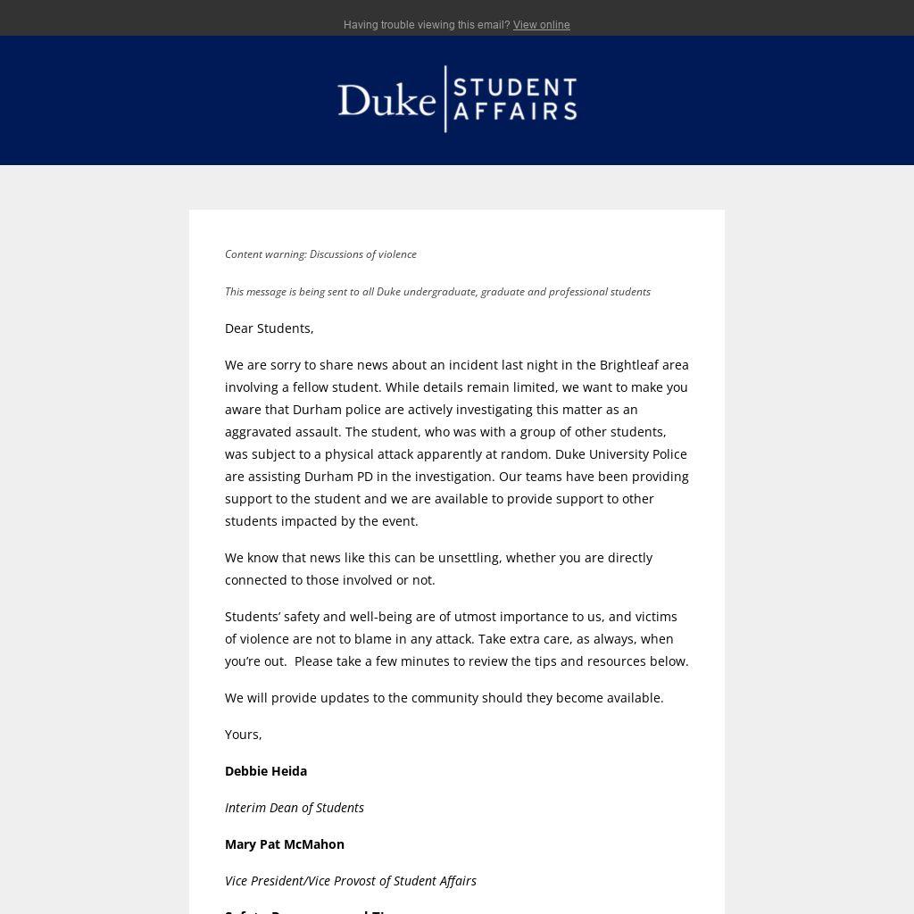 We are sorry to share news about an incident last night in the Brightleaf area involving a fellow student. While details remain limited, we want to make you aware that Durham police are actively investigating this matter as an aggravated assault. The student, who was with a group of other students, was subject to a physical attack apparently at random. Duke University Police are assisting Durham PD in the investigation. Our teams have been providing support to the student and we are available to provide support to other students impacted by the event.