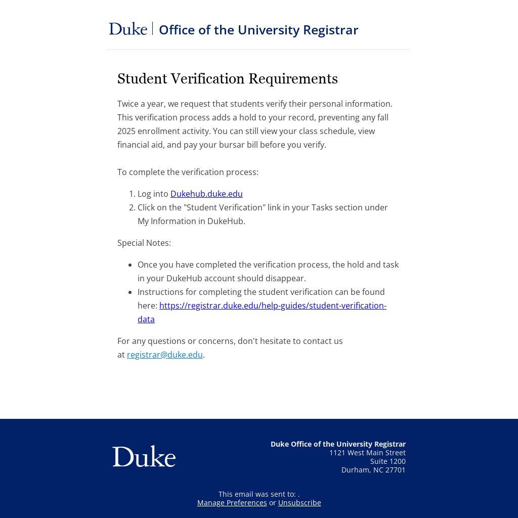 - Click on the "Student Verification" link in your Tasks section under My Information in DukeHub.