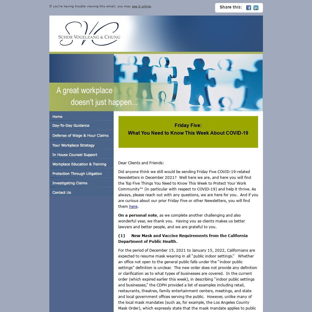 Did anyone think we still would be sending Friday Five COVID-19-related Newsletters in December 2021? Well here we are, and here you will find the Top Five Things You Need to Know This Week to Protect Your Work Community™ (in particular with respect to COVID-19) and help it thrive. As always, please reach out with any questions, we are here for you. And if you are curious about our prior Friday Five or other Newsletters, you will find them here.