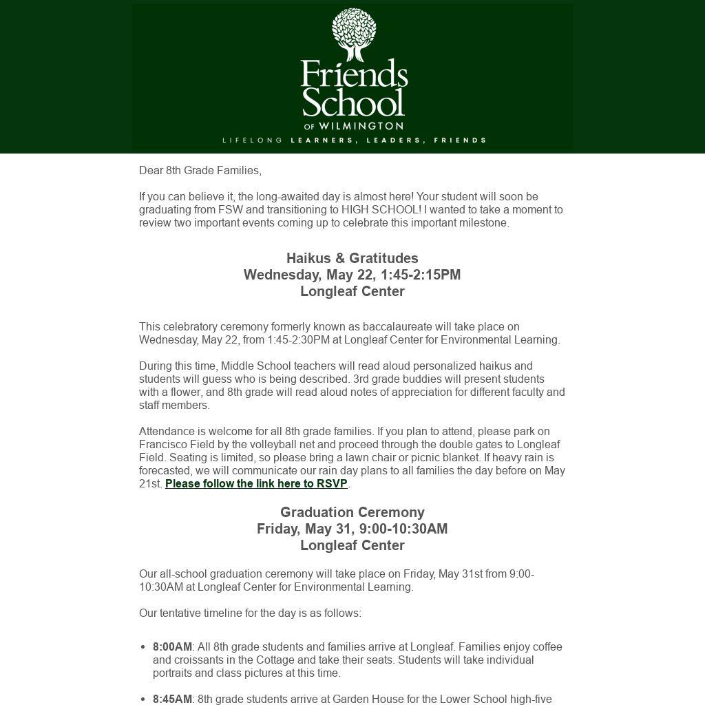 Attendance is welcome for all 8th grade families. If you plan to attend, please park on Francisco Field by the volleyball net and proceed through the double gates to Longleaf Field. Seating is limited, so please bring a lawn chair or picnic blanket. If heavy rain is forecasted, we will communicate our rain day plans to all families the day before on May 21st. Please follow the link here to RSVP.