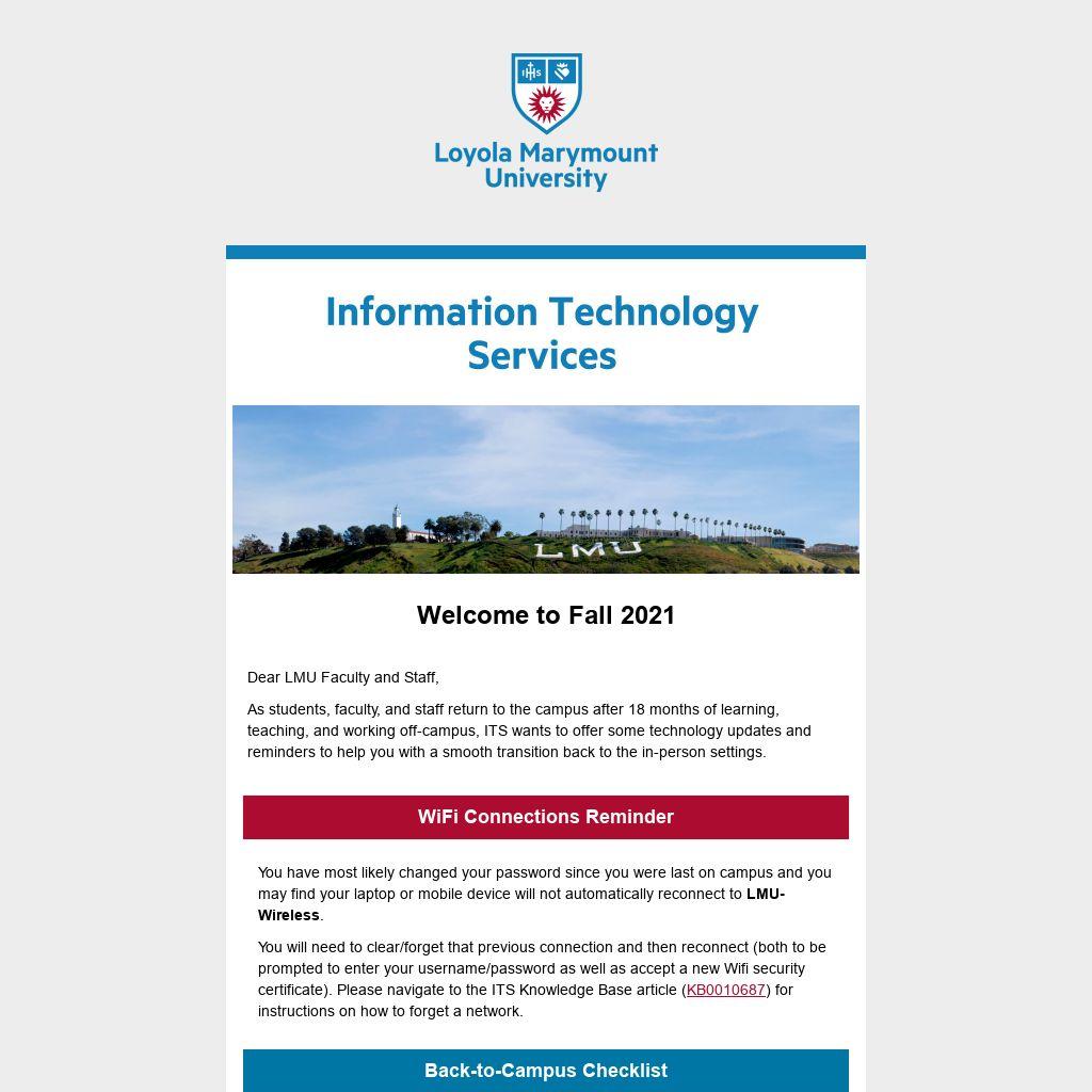 For additional information on back-to-campus technology updates, refer to this LMU This Week Express email sent by LMU MarComm on Aug. 12.