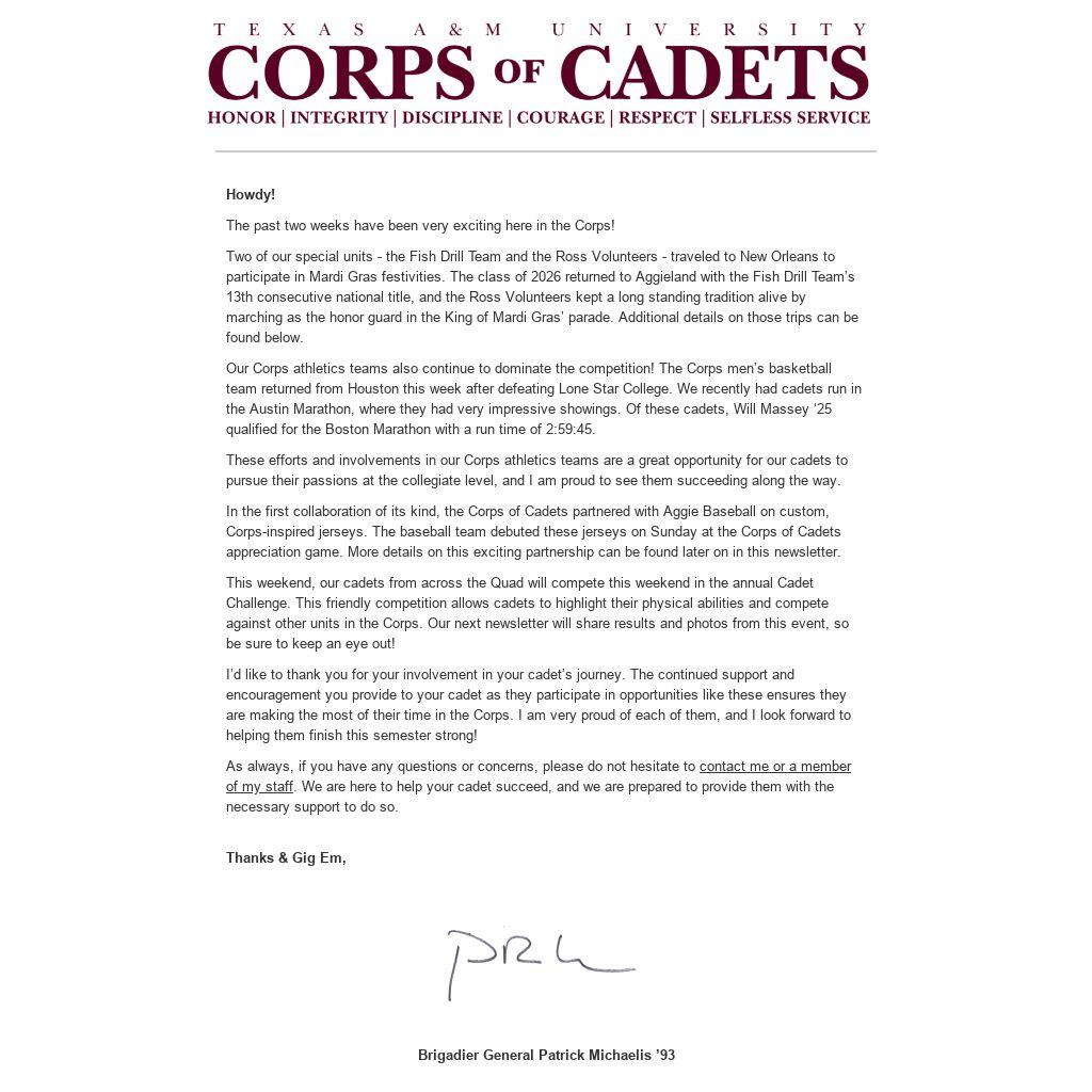 I’d like to thank you for your involvement in your cadet’s journey. The continued support and encouragement you provide to your cadet as they participate in opportunities like these ensures they are making the most of their time in the Corps. I am very proud of each of them, and I look forward to helping them finish this semester strong!