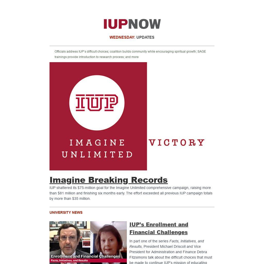 Distributed to IUP employees and students four days a week, IUP Now is the official newsletter of Indiana University of Pennsylvania. It features news from across the IUP website, compiled by the Division of Marketing and Communications. Find out how to get your news and events in IUP Now.