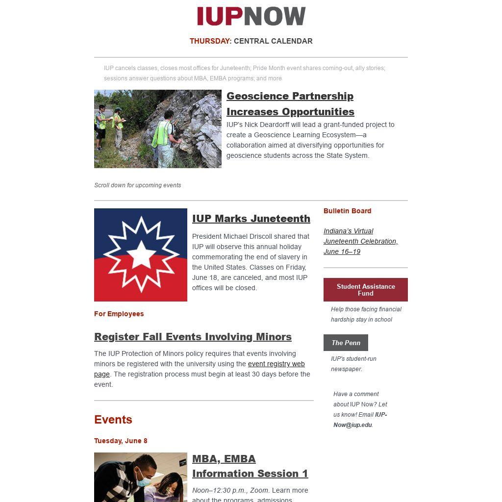 Distributed to IUP employees and students three days a week on its summer schedule, IUP Now is the official newsletter of Indiana University of Pennsylvania. It features news from across the IUP website, compiled by the Division of Marketing and Communications. Find out how to get your news and events in IUP Now.