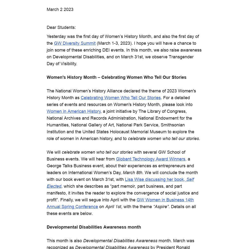 Yesterday was the first day of Women’s History Month, and also the first day of the GW Diversity Summit (March 1-3, 2023). I hope you will have a chance to join some of these enriching DEI events. In this month, we also raise awareness on Developmental Disabilities, and on March 31st, we observe Transgender Day of Visibility.