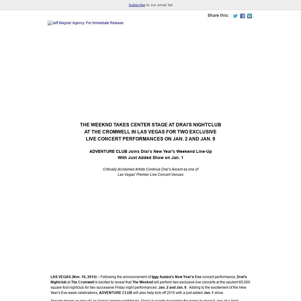 “We are thrilled to have such a truly original and groundbreaking artist like The Weeknd at Drai’s,” notes Drai’s President and Managing Partner, Michael Gruber. “With a recent concert performance from Chris Brown, the announcement of Iggy Azalea’s concert for New Year’s Eve and now two shows with The Weeknd and a special show with Adventure Club we are transforming the nightlife scene once again in Las Vegas with these superstar live shows.”