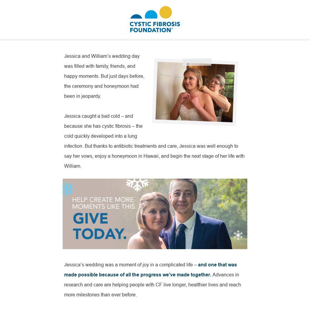 Jessica caught a bad cold – and because she has cystic fibrosis – the cold quickly developed into a lung infection. But thanks to antibiotic treatments and care, Jessica was well enough to say her vows, enjoy a honeymoon in Hawaii, and begin the next stage of her life with William.