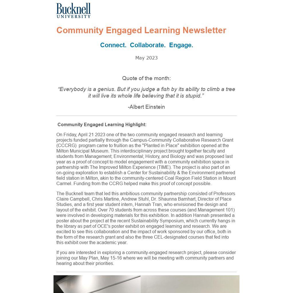 The Bucknell team that led this ambitious community partnership consisted of Professors Claire Campbell, Chris Martine, Andrew Stuhl, Dr. Shaunna Barnhart, Director of Place Studies, and a first year student intern, Hannah Tran, who envisioned the design and layout of the exhibit. Over 70 students from across these courses (and Management 101) were involved in developing materials for this exhibition. In addition Hannah presented a poster about the project at the recent Sustainability Symposium, which currently hangs in the library as part of OCE's poster exhibit on engaged learning and research. We are excited to see this collaboration and the impact of work sponsored by our office, both in the form of the research grant and also the three CEL-designated courses that fed into this exhibit over the academic year.