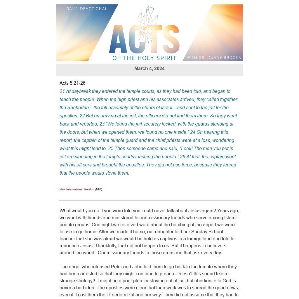 What would you do if you were told you could never talk about Jesus again? Years ago, we went with friends and ministered to our missionary friends who serve among Islamic people groups. One night we received word about the bombing of the airport we were to use to go home. After we made it home, our daughter told her Sunday School teacher that she was afraid we would be held as captives in a foreign land and told to renounce Jesus. Thankfully, that did not happen to us. But it happens to believers around the world. Our missionary friends in those areas run that risk every day.